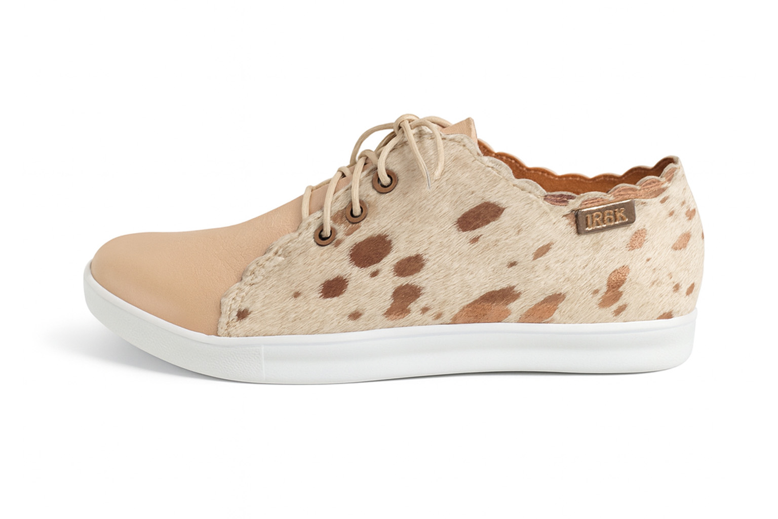 Elevate your footwear game with the Elizabeth Sneaker, where rich African heritage meets contemporary elegance. Featuring a genuine Nguni cowhide upper in natural cream and tan patterns, the shoe is beautifully accented with a rose gold metallic toe cap for a hint of modern luxury.