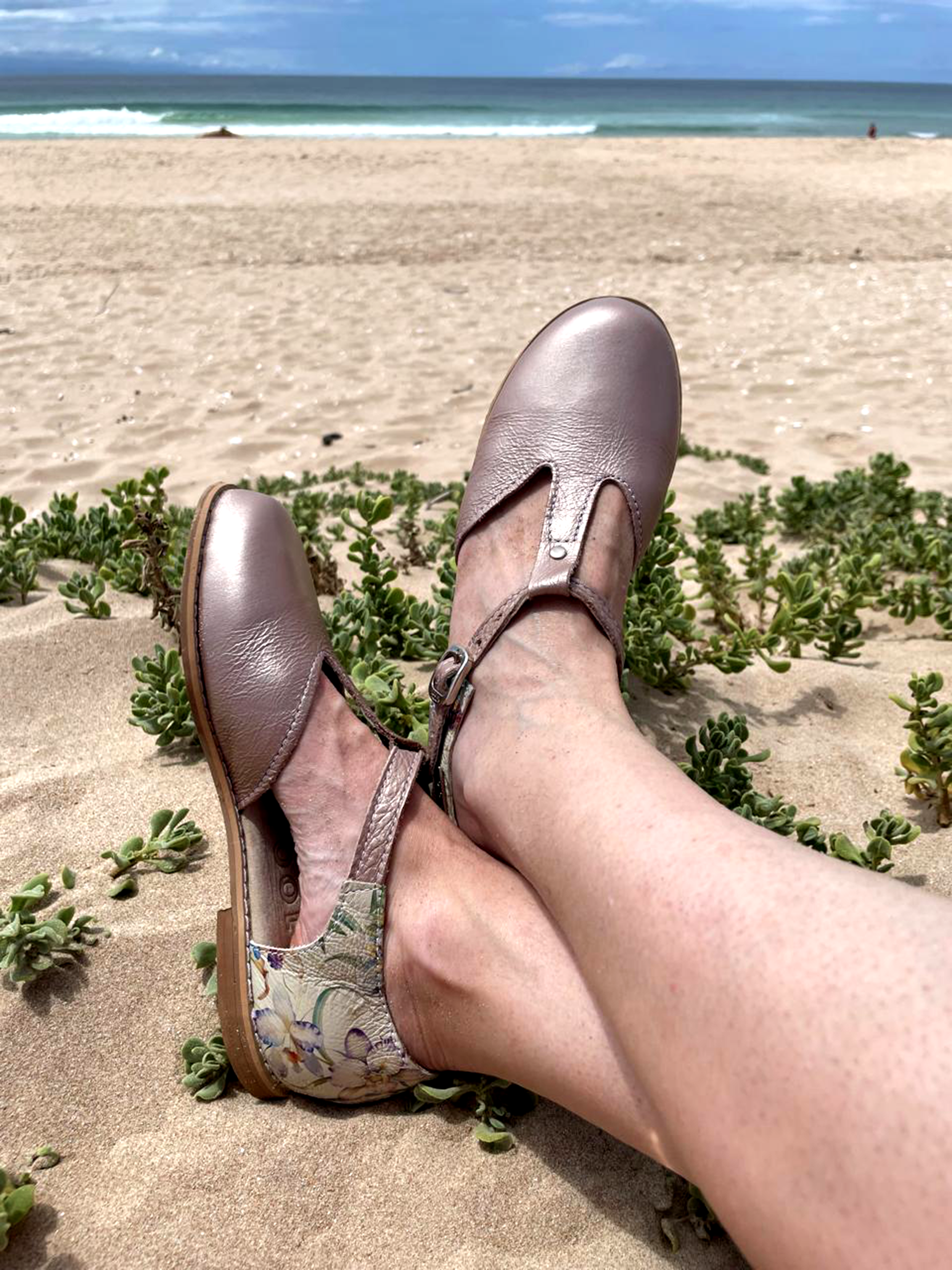 Romantic meets refined in the 100Hz T-Strap Low Heel in Rose Blush. The gently shimmering upper in metallic rose delivers a soft, elegant sheen, perfectly paired with a delicate T-strap silhouette that flatters the foot and adds vintage charm.