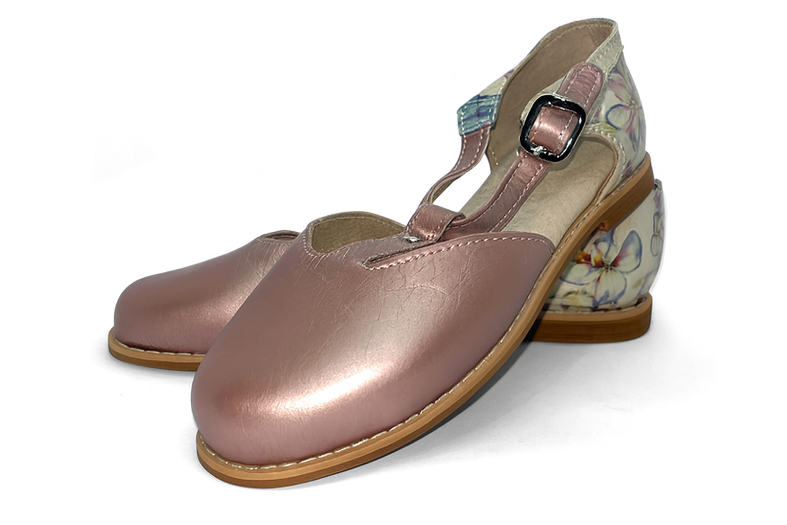 A soft floral heel panel in watercolor tones of lavender, cream, and green contrasts beautifully, making this shoe a subtle statement piece. The adjustable ankle strap with a polished buckle ensures a secure fit, while the low stacked heel provides day-long comfort and graceful posture.